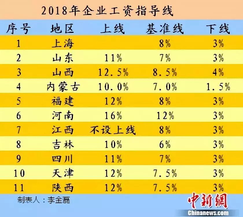 据不完全统计,截至8月21日,至少已有上海、山东、山西、内蒙古、福建、河南、江西、吉林、四川、天津、陕西等11个省份公布了2018年企业工资指导线。企业可按照当地的工资指导线安排职工工资增长。