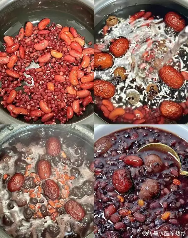 做法:红豆提前浸泡3小时以上,全部食材(除了枸杞)加水煮开转小火煮1小时后,再把枸杞搅匀搅匀即可。