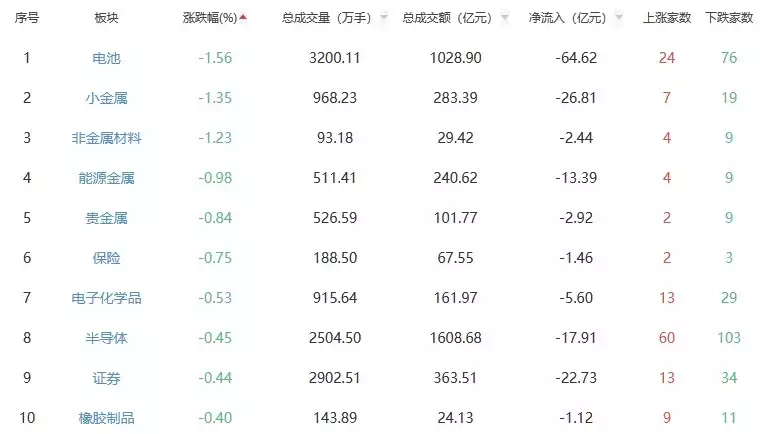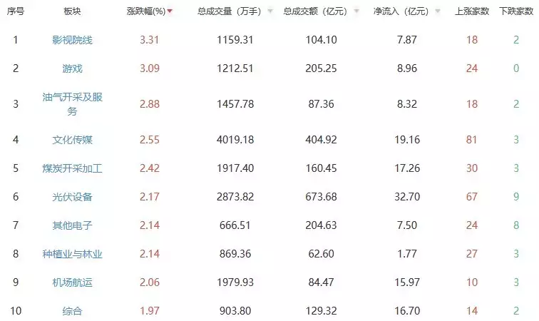 行业板块方面,影视院线、游戏、油气开采及服务等板块涨幅居前,电池、小金属、非金属材料等板块跌幅居前。