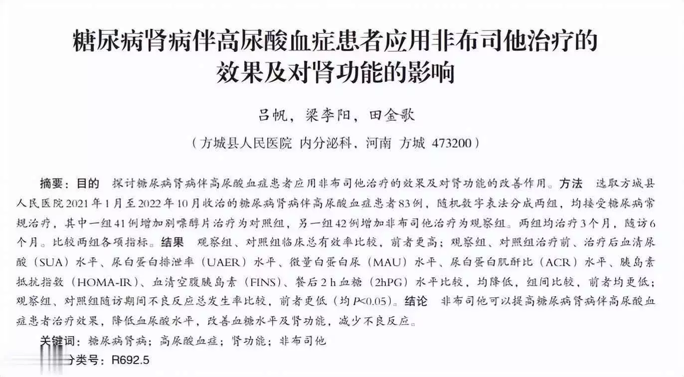 [1]吕帆.糖尿病肾病伴高尿酸血症患者应用非布司他治疗的效果及对肾功能的影响,中国医学工程,2024-11-25