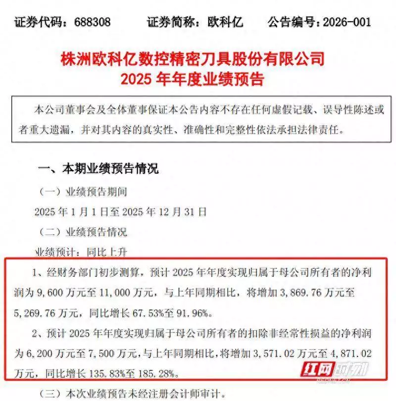 红网时刻新闻1月19日讯(记者 肖娟)1月18日,株洲欧科亿数控精密刀具股份有限公司(以下简称“欧科亿”)发布2025年年度业绩预告,多项核心财务指标预计大幅增长。
