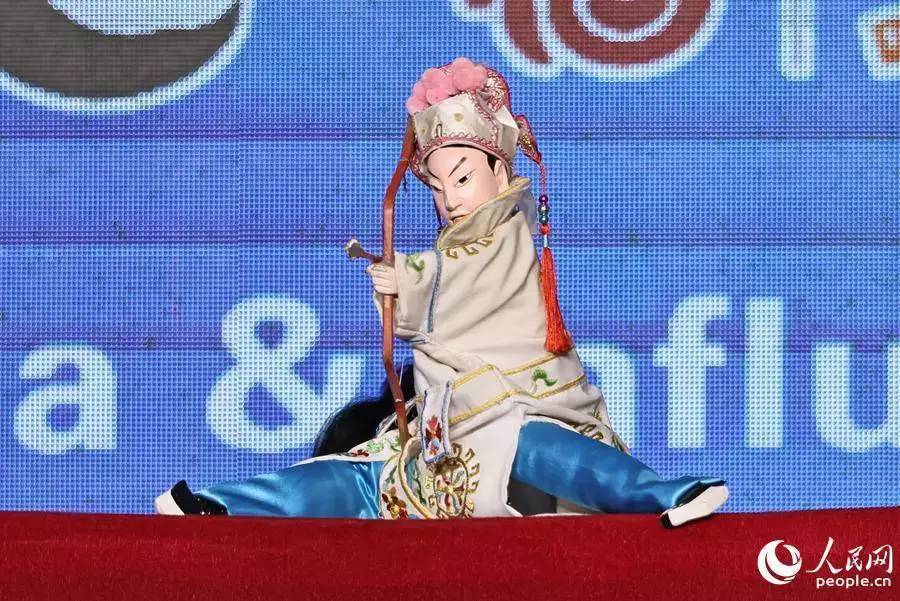 布袋木偶戏《大名府》表演,以 “掌上乾坤” 再现梁山好汉花荣拉弓搭箭,百步穿杨的英武风采。人民网记者 李昌乾摄