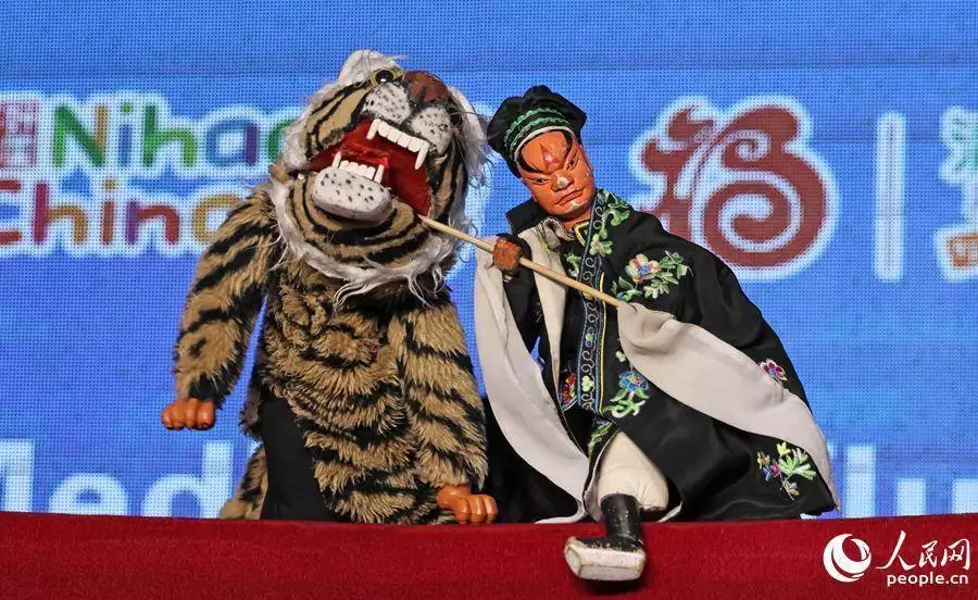 布袋木偶戏演绎武松打虎,艺人掌间腾挪尽显技艺精妙。人民网记者 李昌乾摄